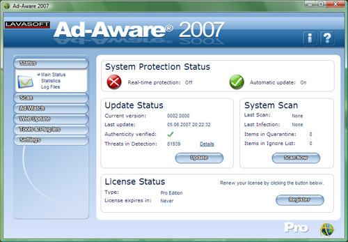 Ad-Aware 2007 Pro - предназначена для поиска и устранения шпионских модулей. При своей работе Ad-Aware сканирует оперативную память, файлы на жёстком диске и определяет в них программы-шпионы и запущенные вредоносные процессы. Также сканируется реестр операционной системы. Если в реестре обнаруживается запись, установленная вредоносной программой, то она удаляется. Работает Ad-Aware достаточно шустро, настройки просты и интуитивно понятны. Если обнаруживаются шпионские модули, то программа предлагает удалить их все или выборочно. Для предотвращения случайного удаления нужного файла или записи в реестре предусмотрена функция восстановления (для этого автоматически создаются backup-копии удаляемых данных). Данная программа (или аналог) должна быть у каждого пользователя, который работает на компьютере в Интернете. Проверять и удалять из системы шпионов просто необходимо. Softwar